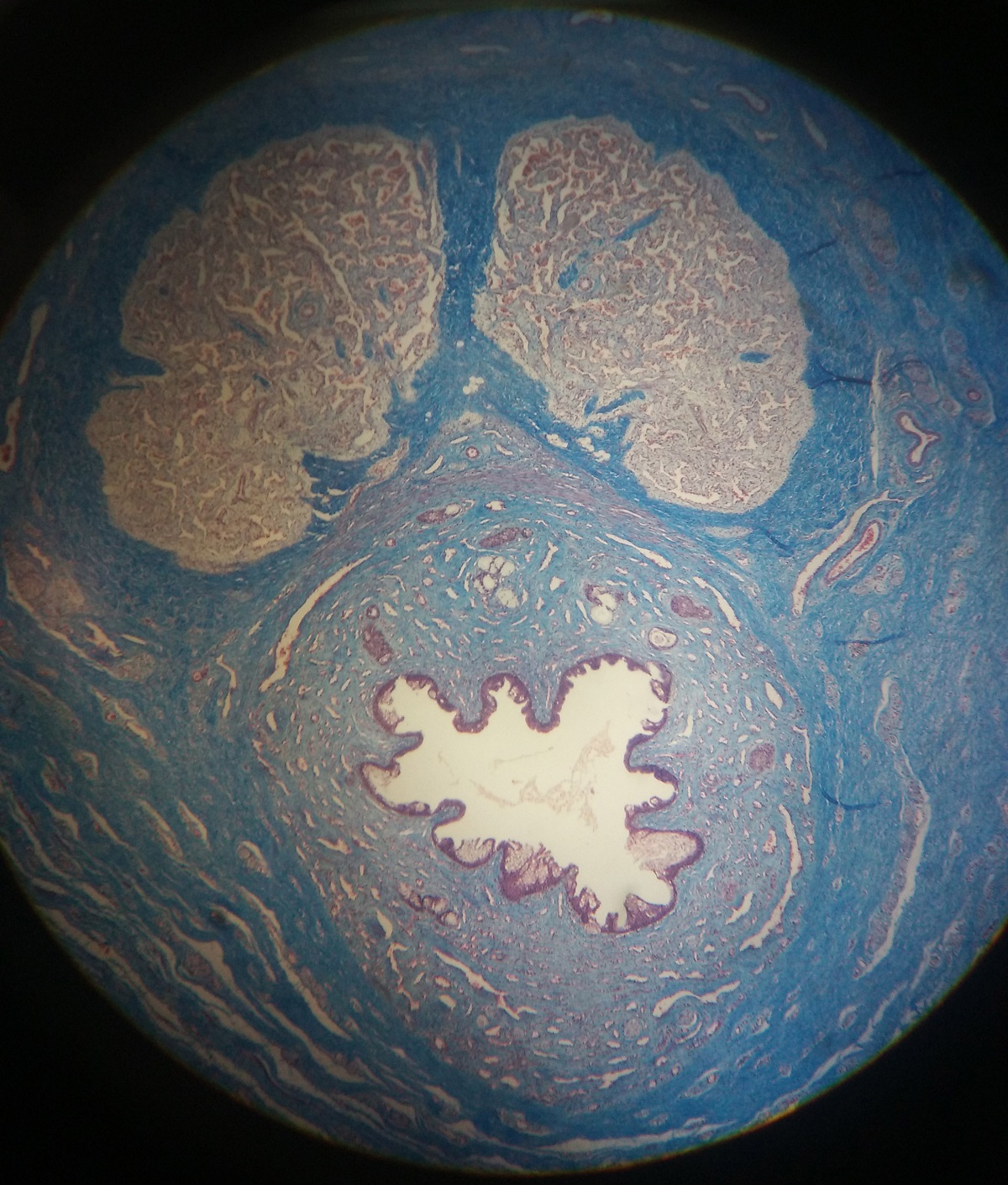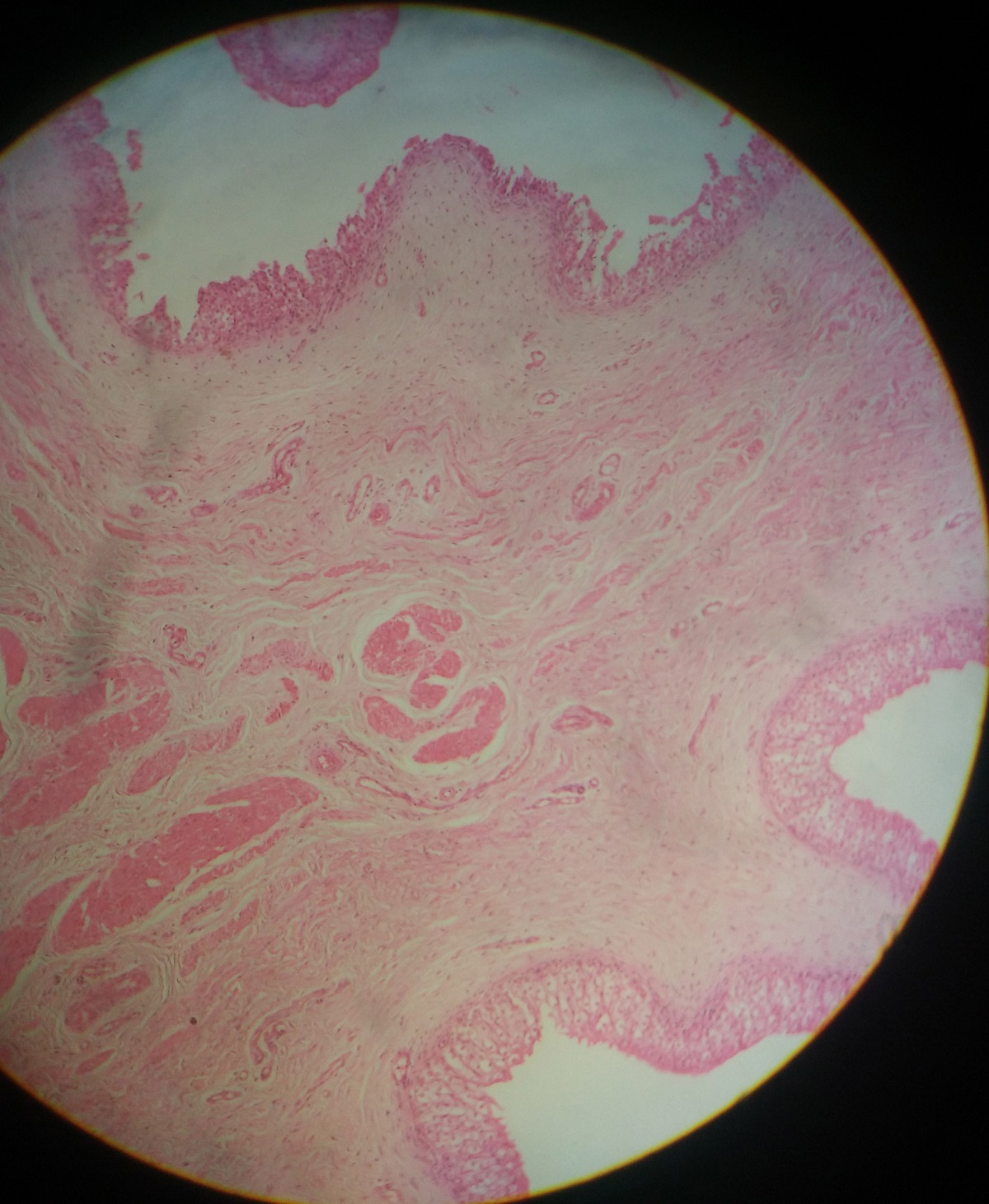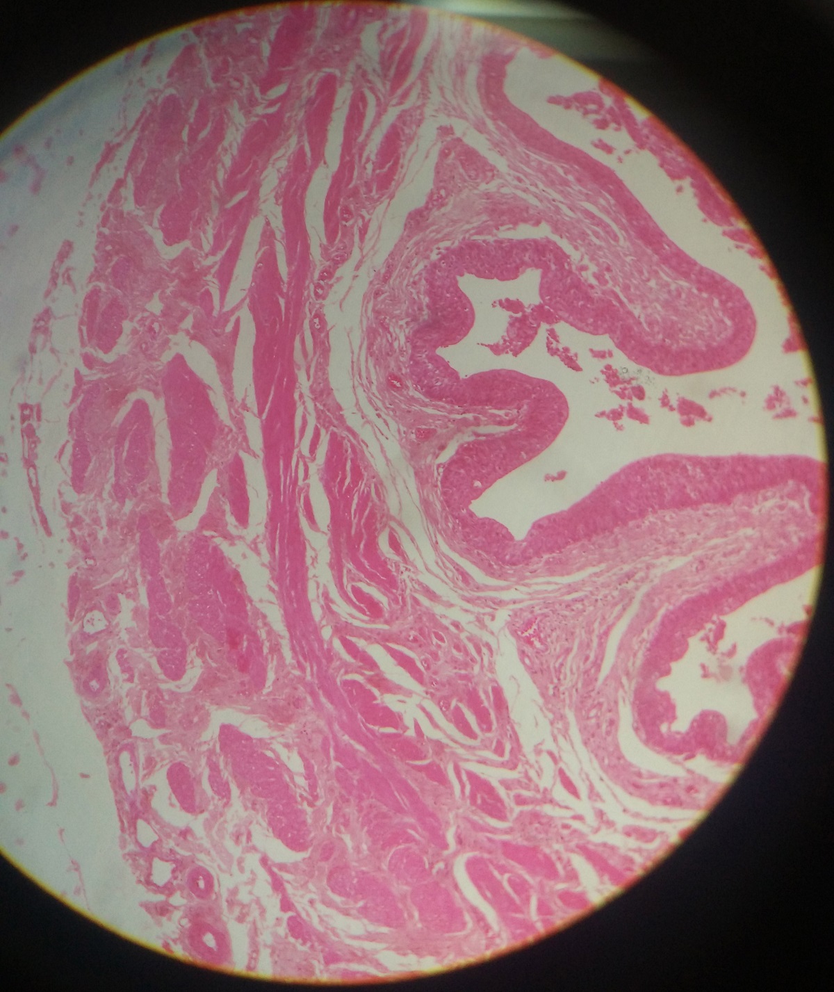 The urinary bladder slide in our college is not of human( in human, preparation of complete circumference would not be possible)so slide in college have complete circumference. One way to distinguish ureter and urinary bladder is to compare magnification.