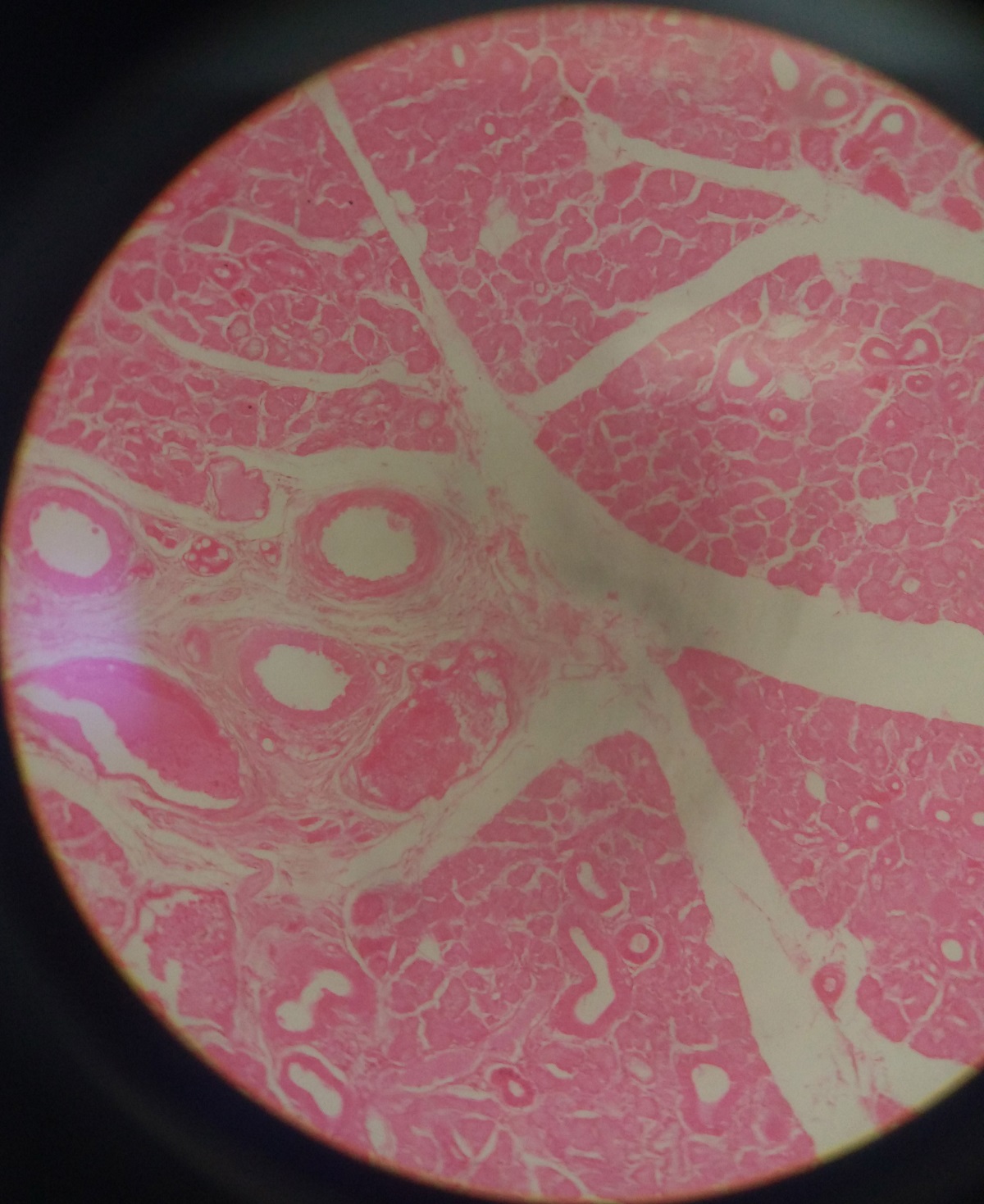 Capillaries between the clumps of secretory cells.