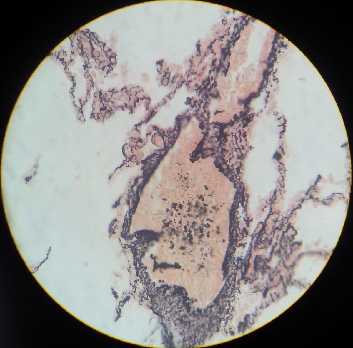 Large no. of distended alveoli filled with secretions and vacuoles