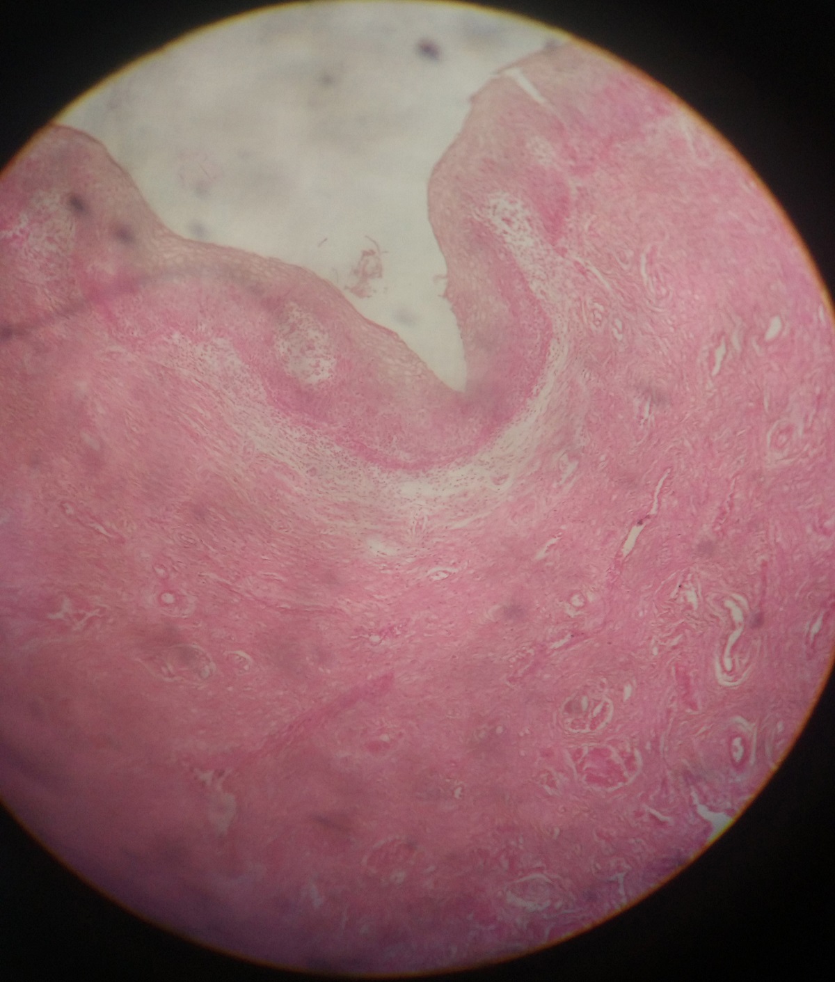 Lamina propria with more fibrous tissue, blood vessels seen.