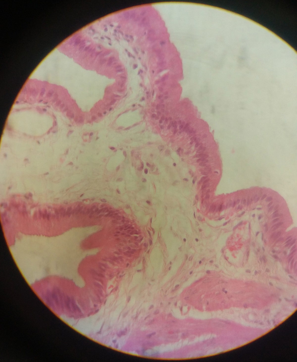 Epithelial lining is of pseudostratified columnar with secretory cells and lipid droplets in cytoplasm giving it foamy appearance
