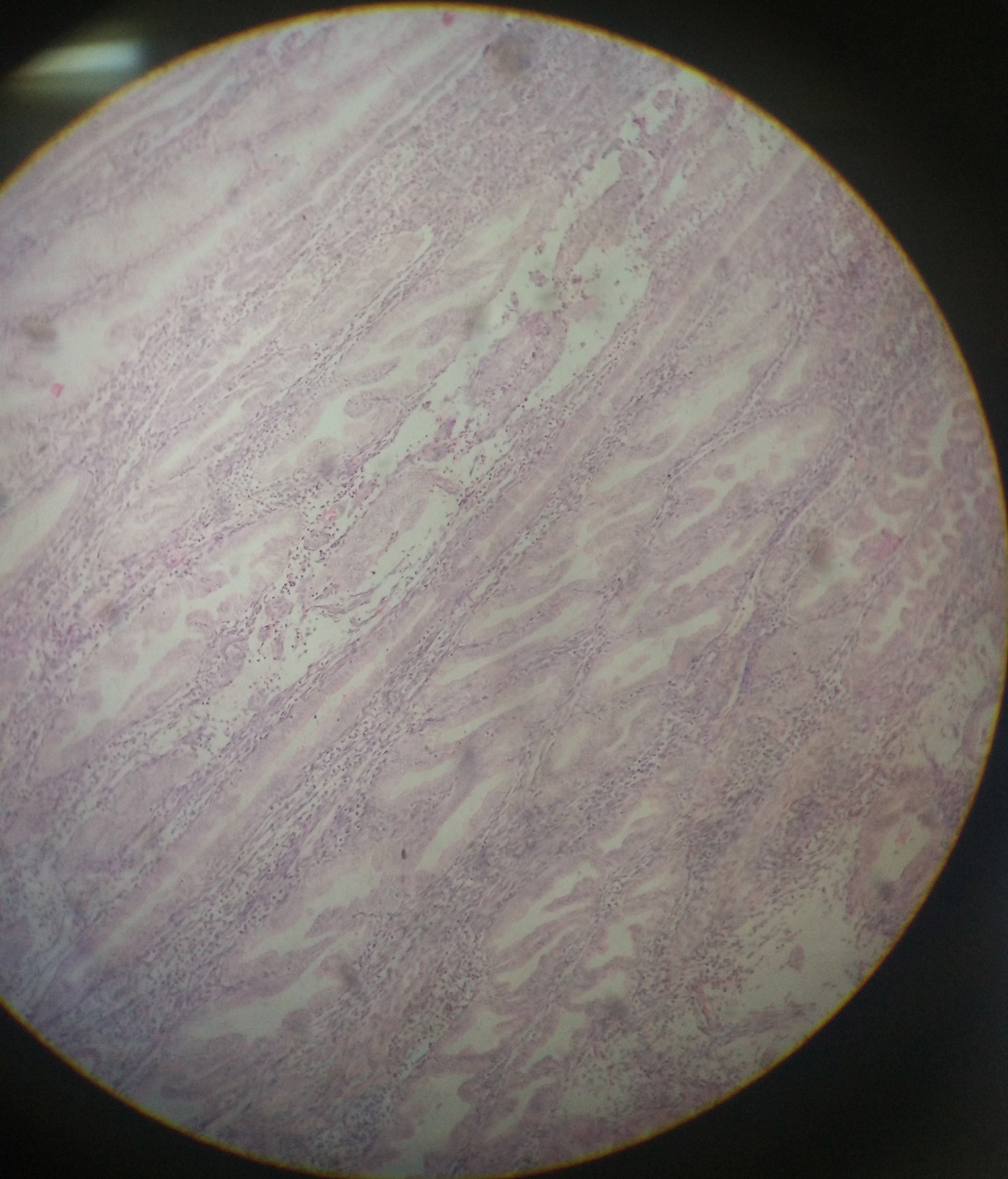 Proliferative: Straight tubular glands; Increased thickness of endometrium